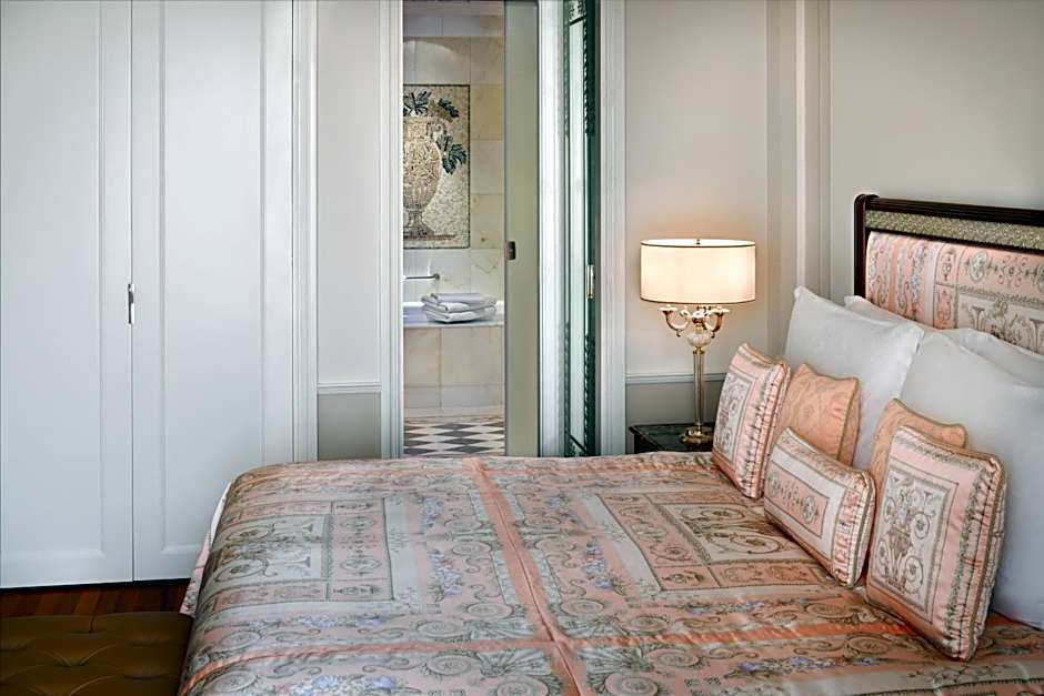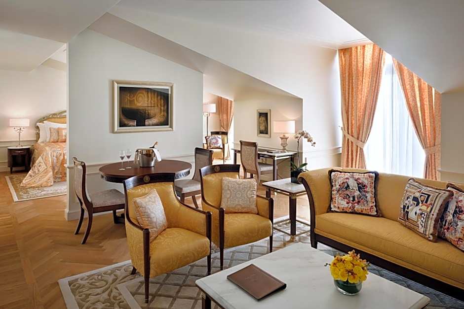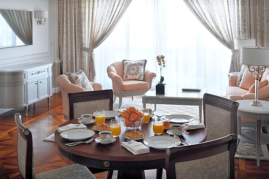 The spacious, bright and elegant suite offers a living area with a large flat screen TV and dining area. The bedroom offers a king-size bed. Opposite of the bed lies a 55 inch flat-screen TV and on the side table is an in-room control panel where you can change the lighting, open/close curtains, listen to radio though a touch. There is a work desk with media connectivity panel. The room has a big walk-in closet with an iron. There is a mini-bar in the room, with complimentary water bottles and tea and coffee making facilities. The bathroom offers a separate rainforest shower and large bath tub and complimentary Versace toiletries.