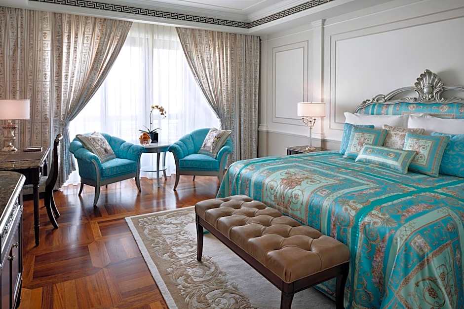 Spacious, bright and elegant, these richly-appointed 50 sqm rooms offer either a King size bed or 2 Twin sized beds. Opposite of the bed lies a 55 inch flat-screen TV and on the side table is an in-room control panel where you can change the lighting, open/close curtains, listen to radio though a touch. There is a work desk with media connectivity panel. The room has a big walk-in closet with an iron. There is a mini-bar in the room, with complimentary water bottles and tea and coffee making facilities. The bathroom offers a separate rainforest shower and large bath tub and complimentary Versace toiletries. Interconnecting rooms are available.