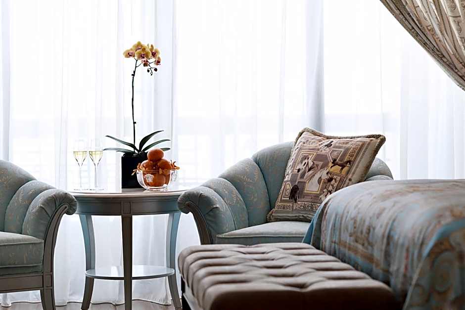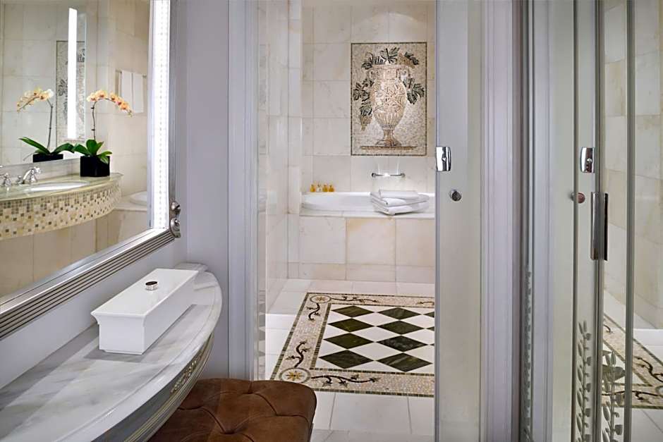 The spacious, bright and elegant suite offers a living area with a large flat screen TV and dining area. The bedroom offers a king-size bed. Opposite of the bed lies a 55 inch flat-screen TV and on the side table is an in-room control panel where you can change the lighting, open/close curtains, listen to radio though a touch. There is a work desk with media connectivity panel. The room has a big walk-in closet with an iron. There is a mini-bar in the room, with complimentary water bottles and tea and coffee making facilities. The bathroom offers a separate rainforest shower and large bath tub and complimentary Versace toiletries.